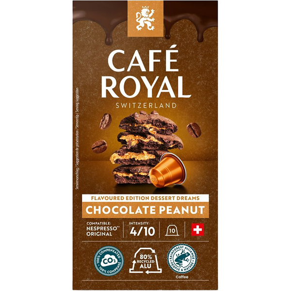 Café Royal Koffiecups Chocolate Peanut combineren de rijke smaak van koffie met zachte tonen van chocolade en een hint van pinda. Een volle, aromatische lungo met een verrassende zoete noot. Perfect voor wie houdt van een speelse twist aan zijn koffiemoment.